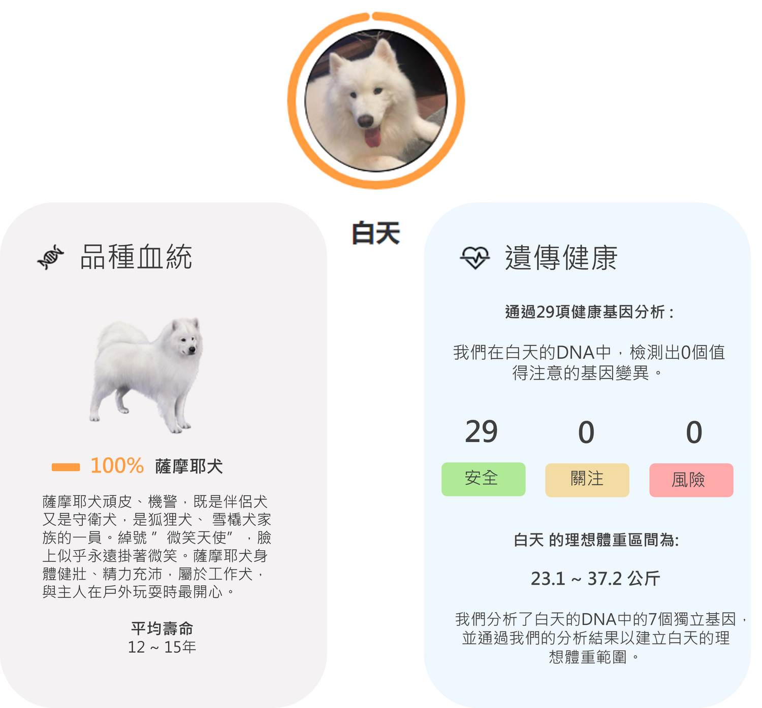 健康遺傳基因只影響狗狗健康狀況的一小部份,也存在許多尚未被發現的健康基因並未在此次檢測中。”需要關注“僅代表有機率遺傳給後代,”存在風險”則代表狗狗有產生此健康狀況的風險,並非必定的檢康狀況也不可知其嚴重程度。