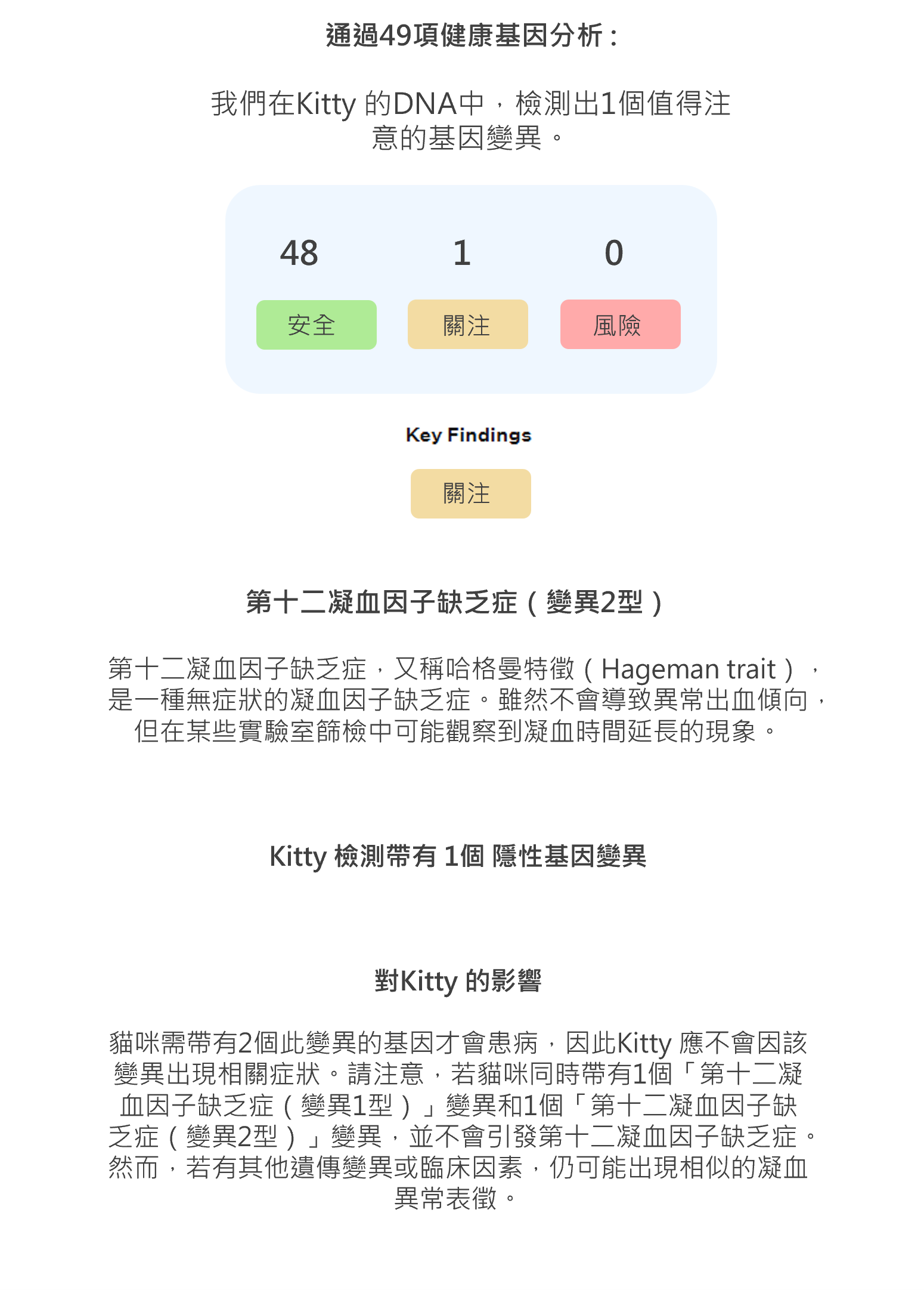 🐾精心製作的樣本報告,檢測結果一目瞭然: 貓咪基因檢測報告